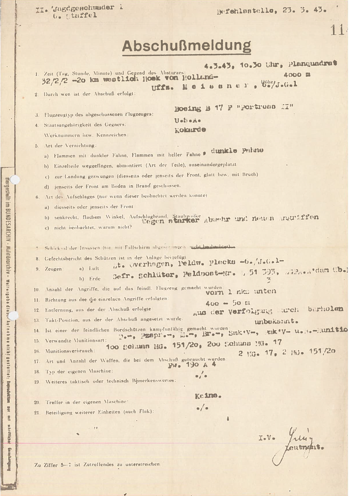 De gedropte bommen worden op rekening van de B17F gezet, gevlogen door William E. Friend. Zijn toestel, wat al beschadigd was bij de aanval boven Texel stort, volgens een Duitse Abschussmeldung, zo’n 20 kilometer ten westen van Hoek van Holland in zee. De coördinaten die vermeld worden zijn planquadrat 32/2/2. Nummer 32 is het vak dat valt tussen 51 graden en 52 graden Noorderbreedte. De cijfers 2/2 verwijzen waarschijnlijk naar het tweede vak en de tweede twee naar het tweede kwart.