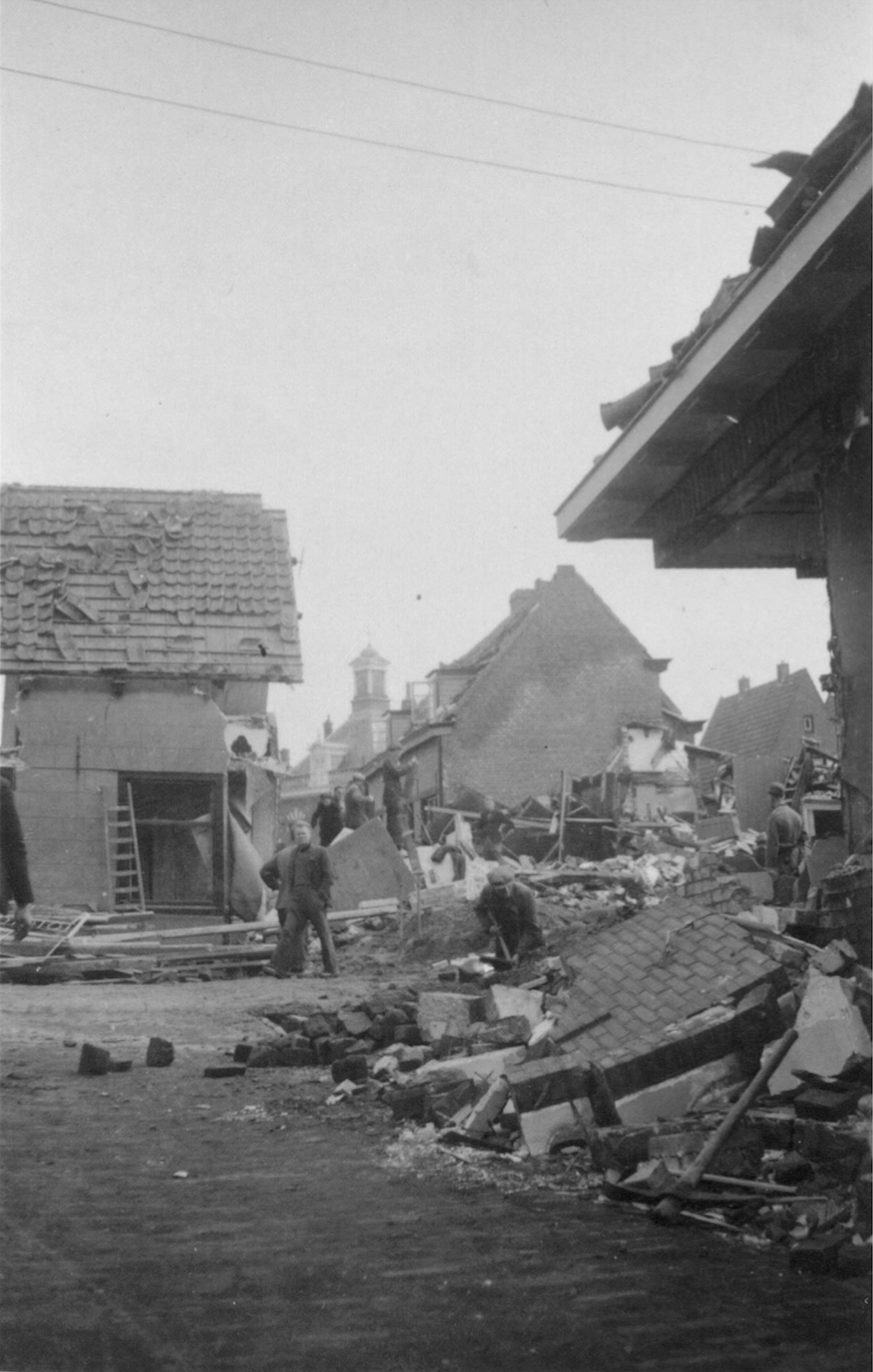 Vanmorgen 4 maart 1943 omstreeks tien uur ronkten 28 zware Amerikaanse bommenwerpers met jager begeleiding over onze omgeving. Nog nooit hadden we zo’n zwaar luchtafweer meegemaakt als hier losbarstte. Ze vlogen in formatie kort bij elkaar, omgeven door een groot aantal detonatiewolkjes van het luchtdoelgeschut. Niet veel later komt de formatie boven de scheepswerf en laten ze hun bommen vallen.