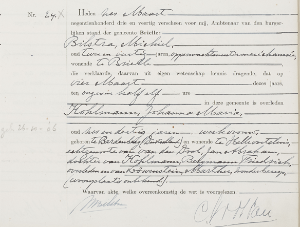 Johanna Maria Kohlmann is geboren in Badenberg (Duitsland) en trouwt op 6 maart in Rotterdam met Jan Abraham van den Dool. Ze is werkvrouw van beroep en woont in Hellevoetsluis.
