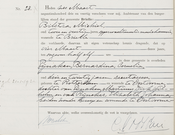 Berdina Cornelia Pijnaken is op 21 januari 1920 geboren in Oostvoorne en werkt als secretaresse op de vakschool voor meisjes. Ze wordt begraven op de begraafplaats aan de Voorweg in Oostvoorne.
