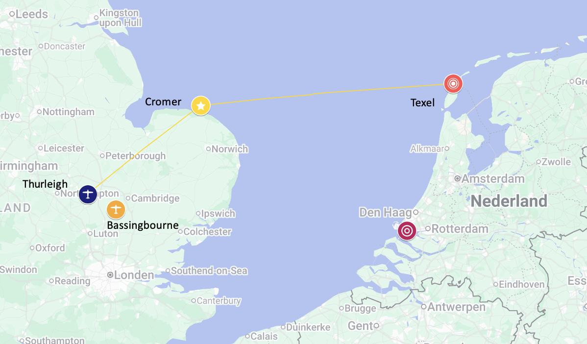Als alle vliegtuigen in formatie vliegen, wordt koers gezet naar de Engelse kust. Na passage van Cromer vliegen ze op 9800 voet hoogte naar de positie 53º 40’ Noord – 003º 00’ Oost. Daar wordt een bocht naar rechts gemaakt richting Texel.