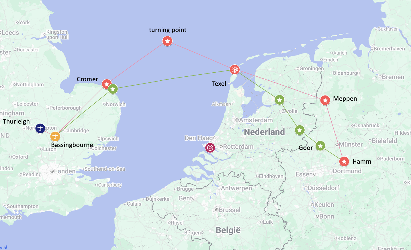 Take-off Leaving airfield Bassingbourne Passage Cromer 53º 40' N – 003º 00' E Texel |
