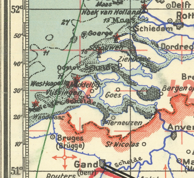 Hoe dichter men bij de Nederlandse kust komt hoe meer bewolking er komt en het zicht wordt slechter. Net over de noordpunt van Texel ligt een “veilige” corridor waar men buiten bereik van afweergeschut is.