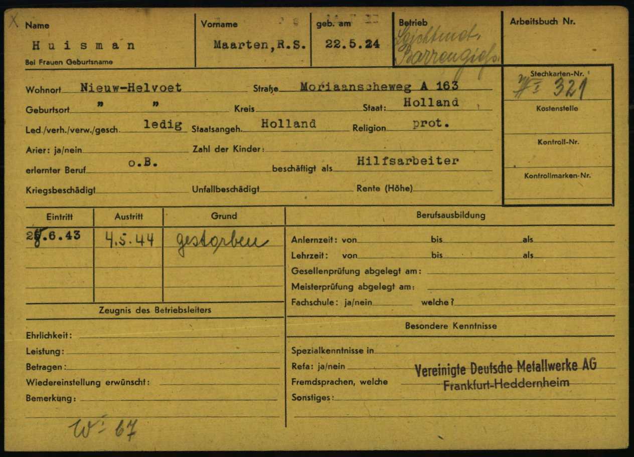 Maarten Regien Sietke Huisman woont op de Moriaanseweg en komt door de arbeitseinsatz in Frankfurt terecht, hij werkt daar voor Vereinigte Deutsche Metallwerke Ag, Frankfurt-Heddernheim. Van 5 januari tot 27 maart 1944 wordt hij behandeld voor gastritus en griep. Op 21 april 1944 beland hij in het ziekenhuis van Köppern met tuberculose en overlijd. Hij wordt begraven in Frankfurt am Mein begraven en later herbegraven op de oude begraafplaats aan de Smitsweg.