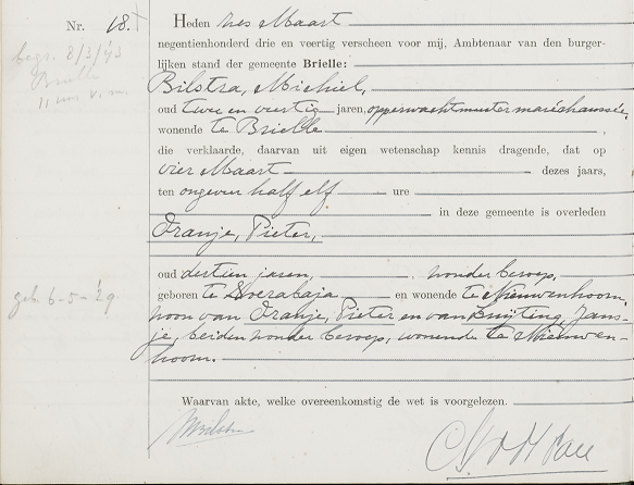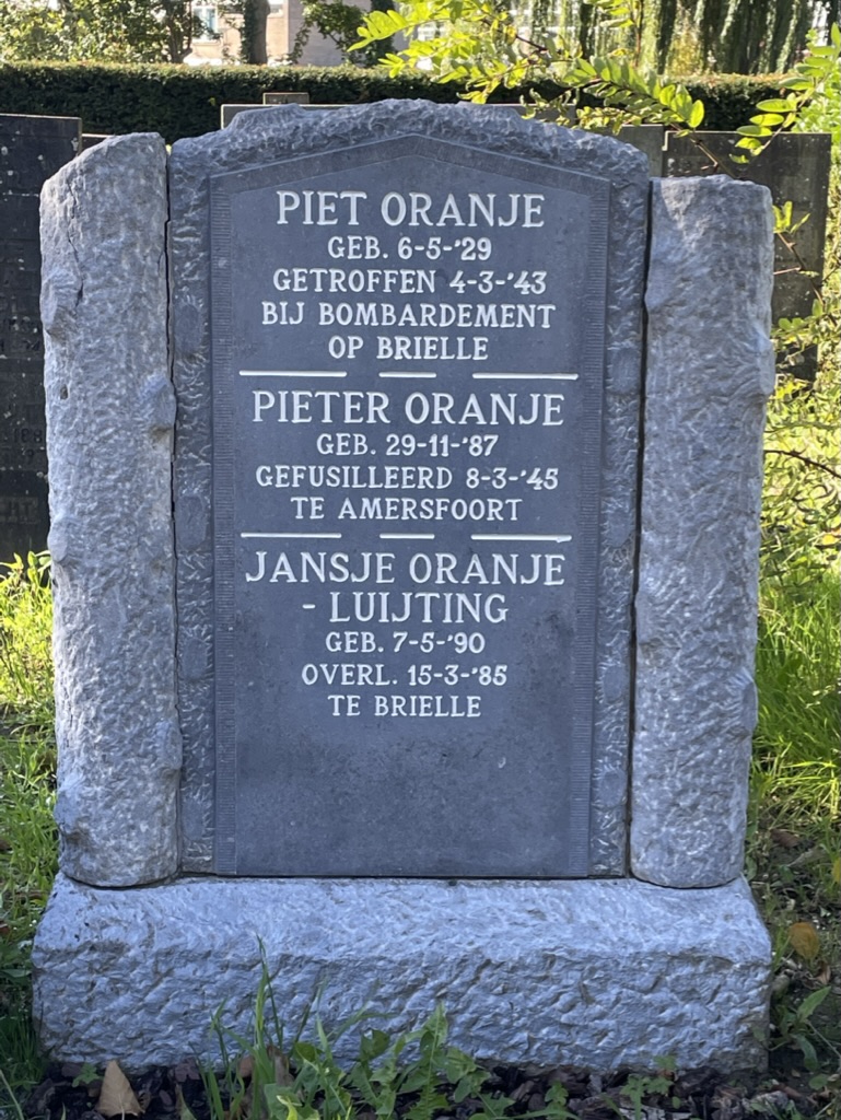 Piet Oranje komt om als er rond 10:30 uur op 4 maart 1943 Bommen op Brielle vallen. Hij ligt begraven in Brielle op de Oude Algemene Begraafplaats aan de G.J. van den Boogerdweg.