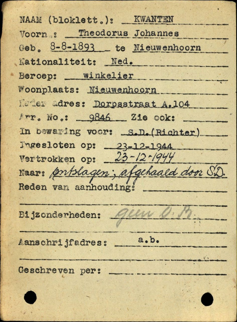 Theodorus Johannes Kwanten trouwt op 18 september 1919 in Brielle met Engelina Maria Slok. Ze krijgen 2 kinderen, een dochter en zoon. Van beroep is hij kleermaker. Gedurende de bezetting zit hij in het verzet en wordt Commandant van de Nederlandse Binnenlandse Strijdkrachten. In de avond van 22 december 1944 wordt Theodorus Johannes Kwanten door twee Duitse militairen opgepakt. Zijn woning wordt doorzocht maar er wordt dan niets gevonden. Pas op kerstavond worden de verborgen wapens, munitie en radio’s gevonden. Theodorus Johannes Kwanten is vastgezet in de Heesterhof te Oostvoorne en 23 december afgevoerd naar het Huis van Bewaring Noordsingel in Rotterdam. Via het Oranjehotel, gevangenis in Scheveningen wordt hij naar kamp Amersfort gebracht. Op 23 december zijn er zeven eilandbewoners door Kriminal Oberassistent Richter aangegeven. Uit het arrestantenregister van de Rotterdamse politie is het aannemelijk dat dit een verzetsgroep was en bestond uit: Frederik Hendrik Gijsbertus van Itterson (Nr 9844), Cornelis de Jonge (Nr 9845), Theodorus Johannes Kwanten (Nr 9846), Jan Boot (Nr 9847), Pieter Oranje (Nr 9848), Pieter Burik (Nr 9849), Adriaan Diederik van Bergeijk (Nr 9850). Net als Pieter Oranje zal Theodorus Johannes Kwanten te boek hebben gestaan als Todeskandidat. Een Todeskandidat was een gevangene die op een lijst stond om gefusilleerd te worden als represaille voor een aanslag van het verzet. Samen met Pieter Oranje (begraven te Brielle) wordt hij op 8 maart 1945 gefusilleerd en begraven in een massagraf. In augustus 1945 geïdentificeerd en herbegraven op de gemeentelijke begraafplaats Rusthof te Amersfoort.