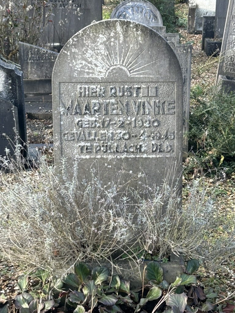 Maarten Vinke woont in Nieuwenhoorn en heeft bij de infanterie gezeten. Daarnaast heeft hij een melkzaak. Hij is via de arbeitseinsatz in Pullach terecht gekomen. Daar is hij door granaatvuur om het leven gekomen. Hij wordt begraven op het Friederichskerkhof. In november 1951 wordt hij herbegraven op de gemeentelijke begraafplaats in Nieuwenhoorn.