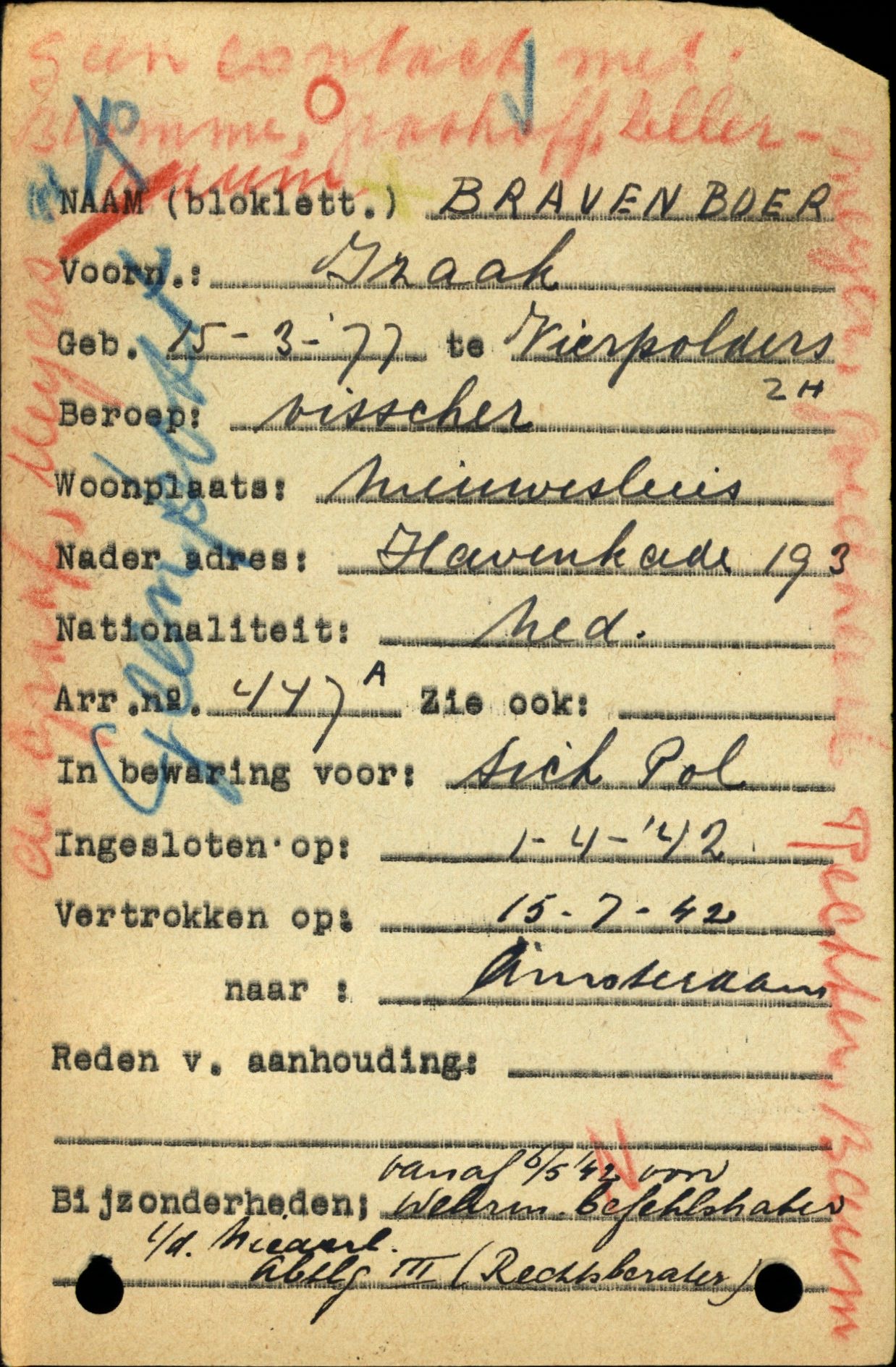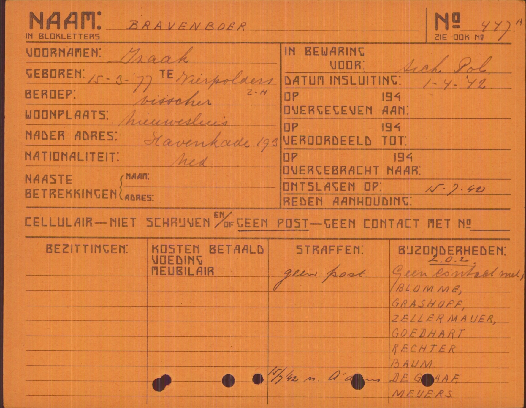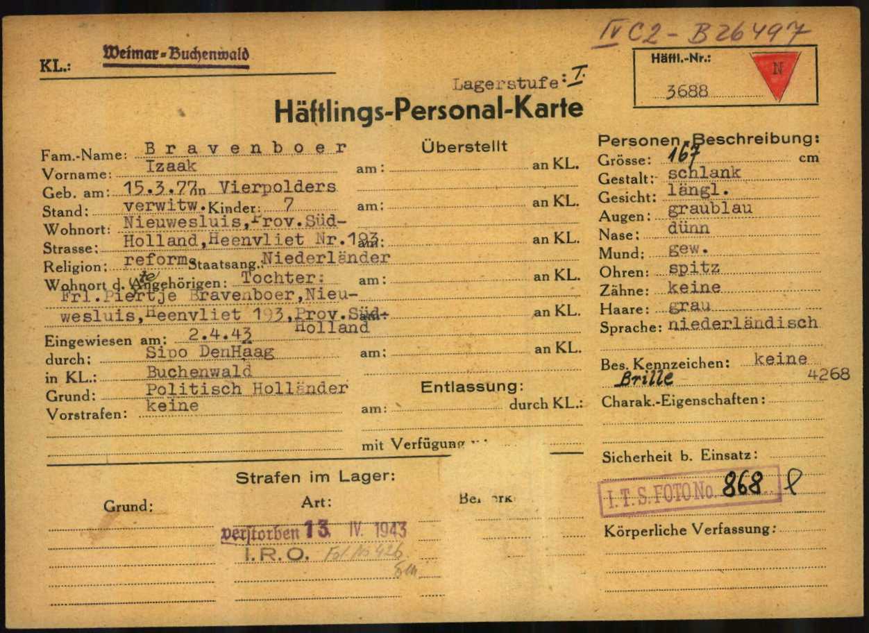 Izaäk Bravenboer is geboren in Vierpolders en visser van beroep. Trouwt op 12 september 1900 met Wilhelmina van IJperen. Ze wonen in Nieuwesluis op de Havenkade en krijgen drie kinderen. Wilhelmina overlijd op 27 juni 1919. In de oorlog verkoopt hij een boot aan Engelandvaarders en wordt op 1 april 1942 opgepakt door de SIPo (sicherheitzpolizei). Eerst wordt hij vastgezet in het Huis van Bewaring Noordsingel te Rotterdam en op 15 juli 1942 doorgestuurd naar Amsterdam. Pas op 15 juli 1943 wordt hij naar Vught gebracht. Op 19 maart 1943 gaat hij op transport naar kamp Weimar – Buchenwald. Op de lijst van de nieuwaangekomen gevangenen van 7 april staat hij vermeld met nr 3688 als schutzhäftling (beschermende gevangene). Hij overlijdt niet veel later op 13 april 1943 om 6:45 aan acuut hartfalen.