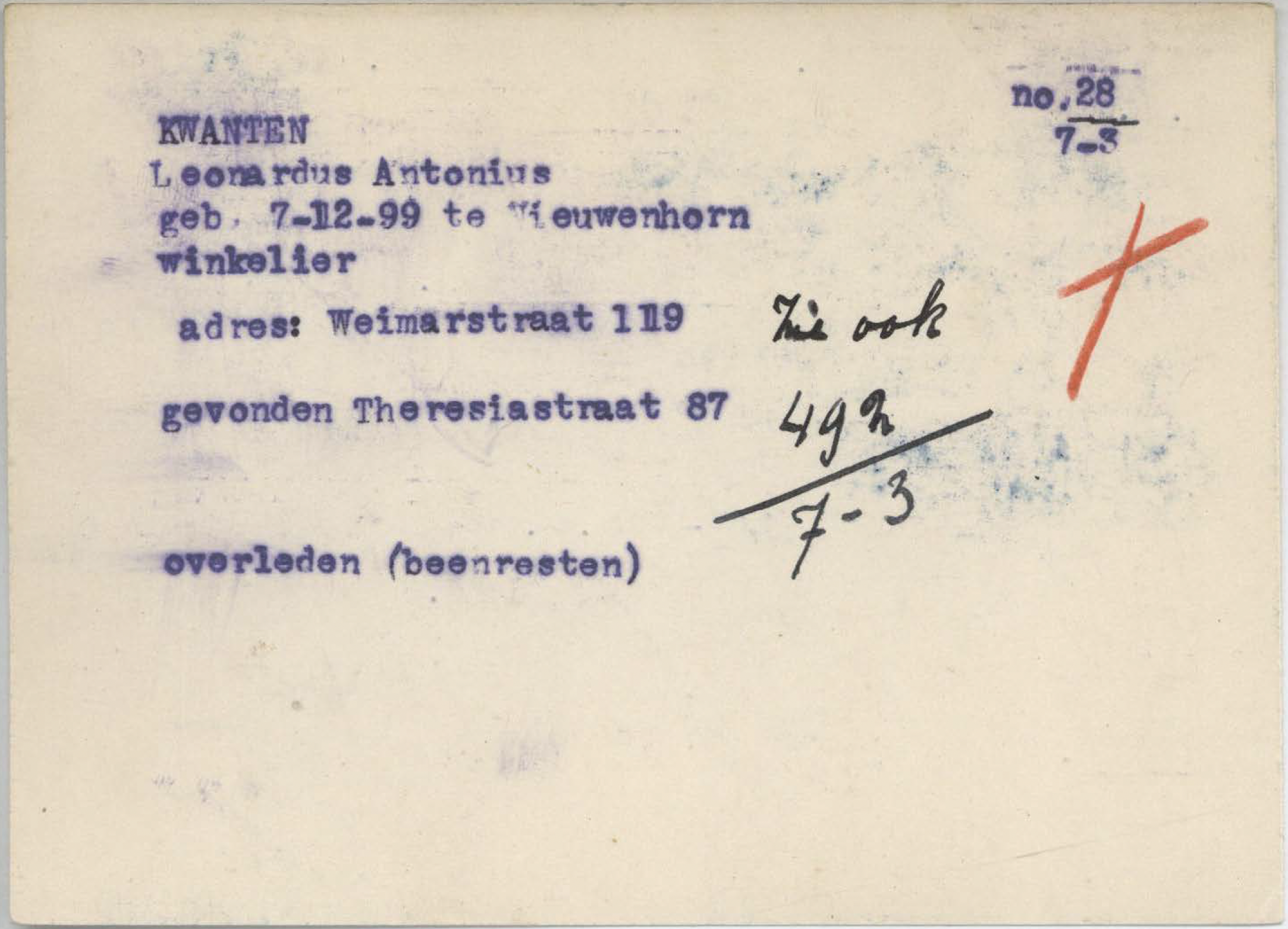 Leonardus Antonius Kwanten is de broer van Theodorus Johannes Kwanten uit Nieuwenhoorn. Leonardus woont op de Weimarstraat 119 in Den Haag, waar hij een winkel in manufacturen heeft. Hij komt om tijdens het geallieerde bombardement op het Bezuidenhoutkwartier. In de puinhopen werden tussen zijn beenderen nog persoonlijke spullen gevonden. Dit waren een sigarenknipper, sleutels en een vulpotlood. Meer formulieren zijn te zien op de pagina: dodenboekbezuidenhout.